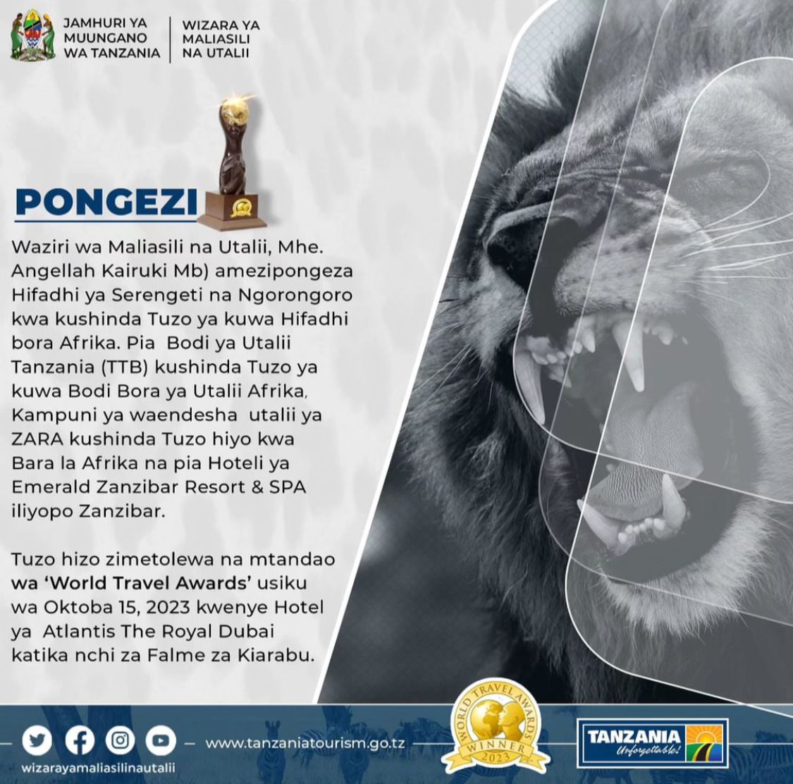 We extend our heartfelt gratitude to the numerous media outlets that have supported and interviewed us about our recent awards at the 2023 World Travel Awards. In Arusha, Kadoshi TV, Millard Ayo, Arusha 24, Sunrise Radio & Ngilisho TV, Radio 5, Motive TV, and Mega FM played a crucial role in spreading the word. In Moshi, we are thankful to Azam TV, Kicheko FM, Wasafi TV, Moshi FM, Clouds TV, Banana FM, TBC, ITV, Star TV, Daily News, and Nipashe for their invaluable support in sharing our achievements. Your partnership and dedication to highlighting our success are deeply appreciated. |